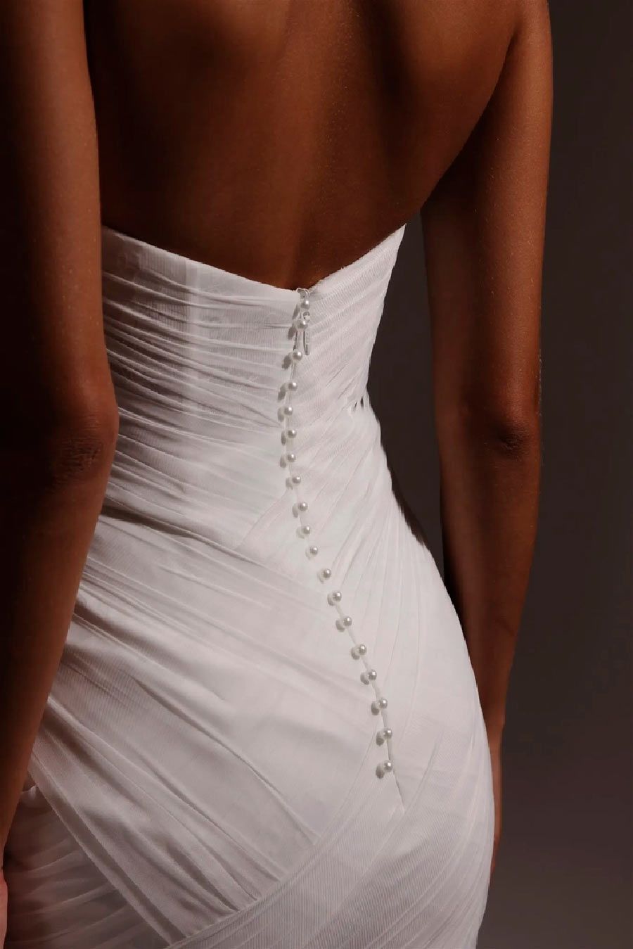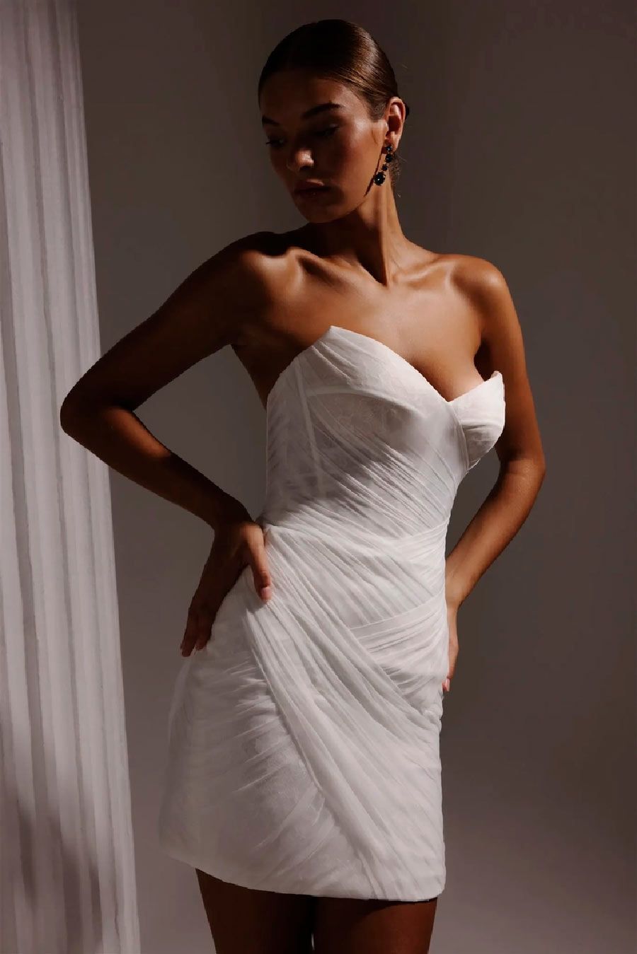 Crafted to perfectly hug the body, a boned bodice provides support, and the mid-thigh length lets your legs be the star of the day. Soft tulle is expertly woven together in precise angles to complement the curves of a brides figure, while a layer of Chantilly lace peeks through for a touch of sex appeal.