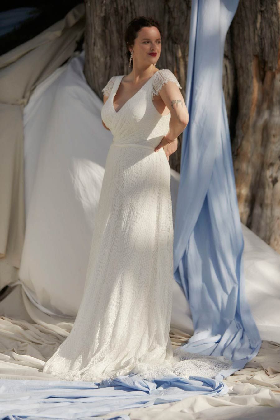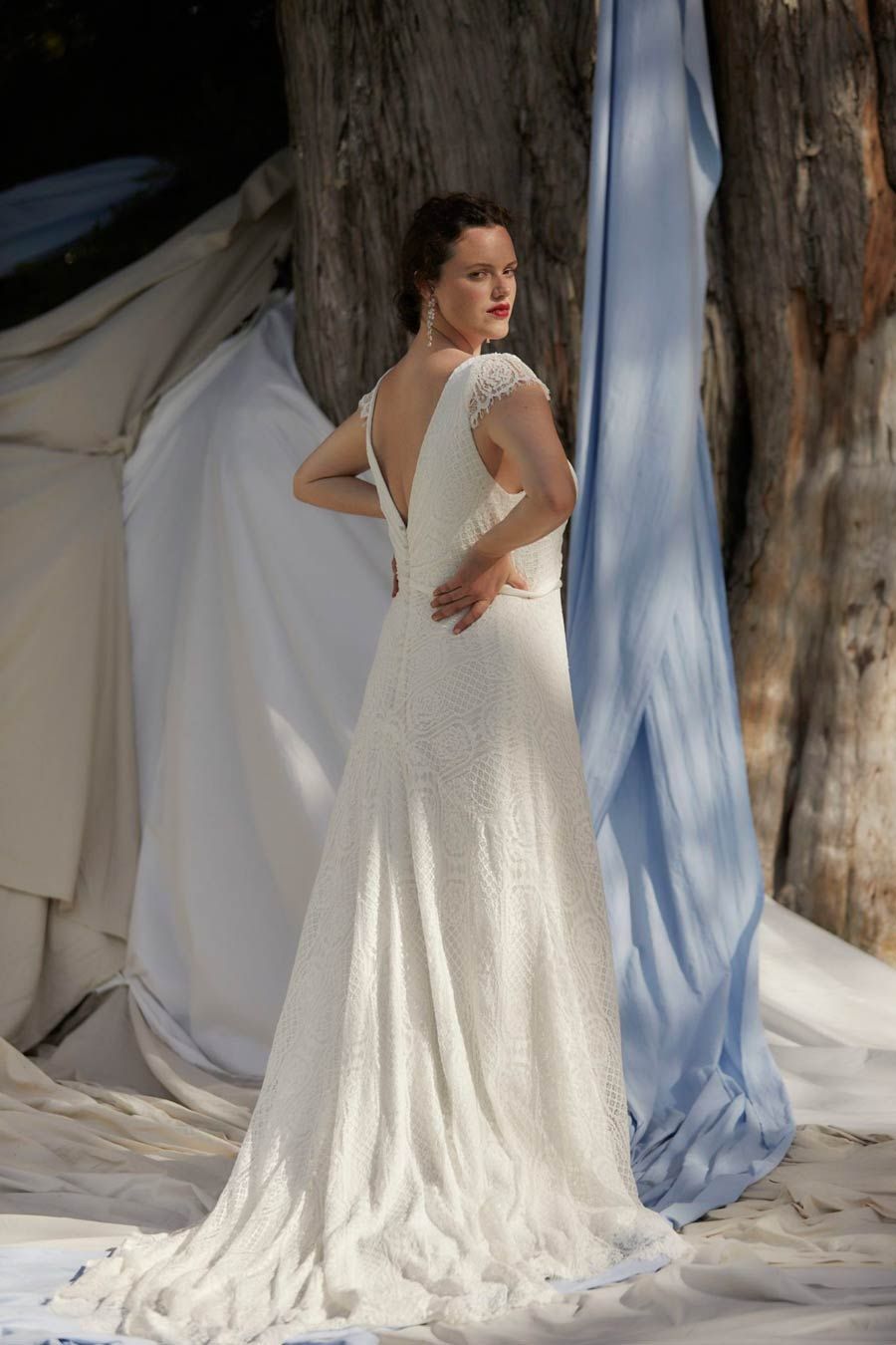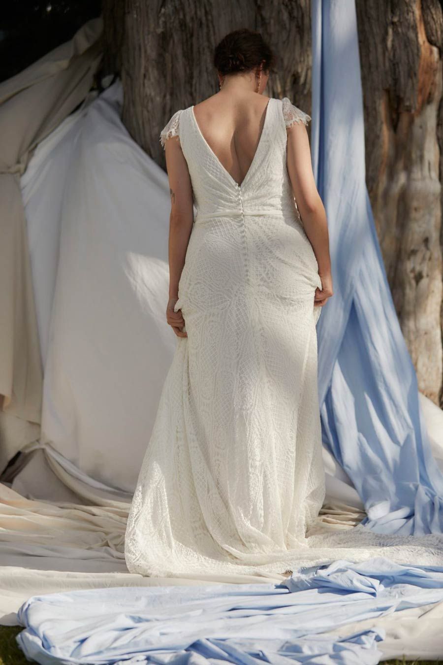 The corseted bodice features a deep V neck, crossover draping, and a cute cap sleeve made from unlined lace for more coverage and a relaxed silhouette. At the back, a low V leads to a row of lace-covered buttons to secure.