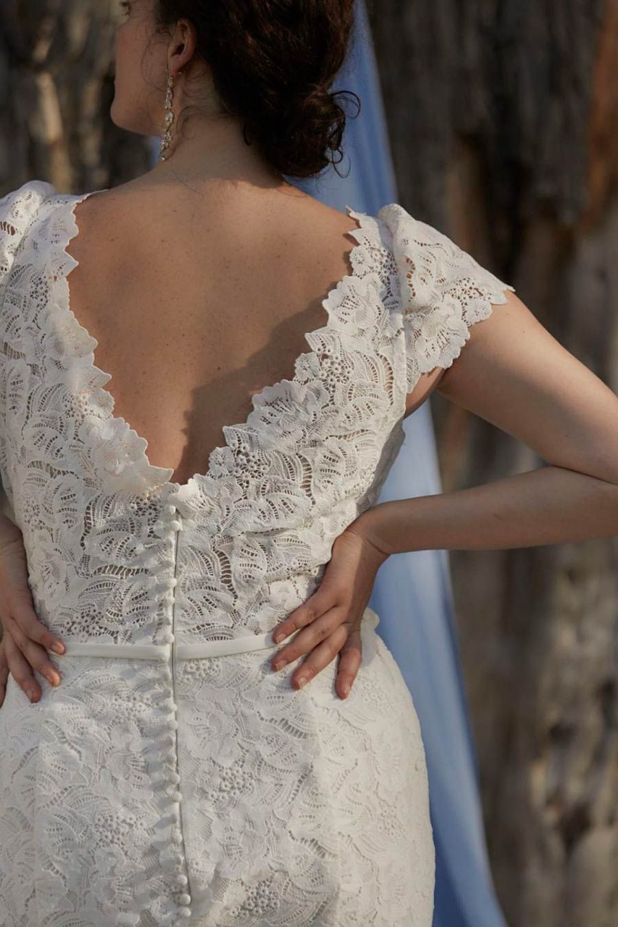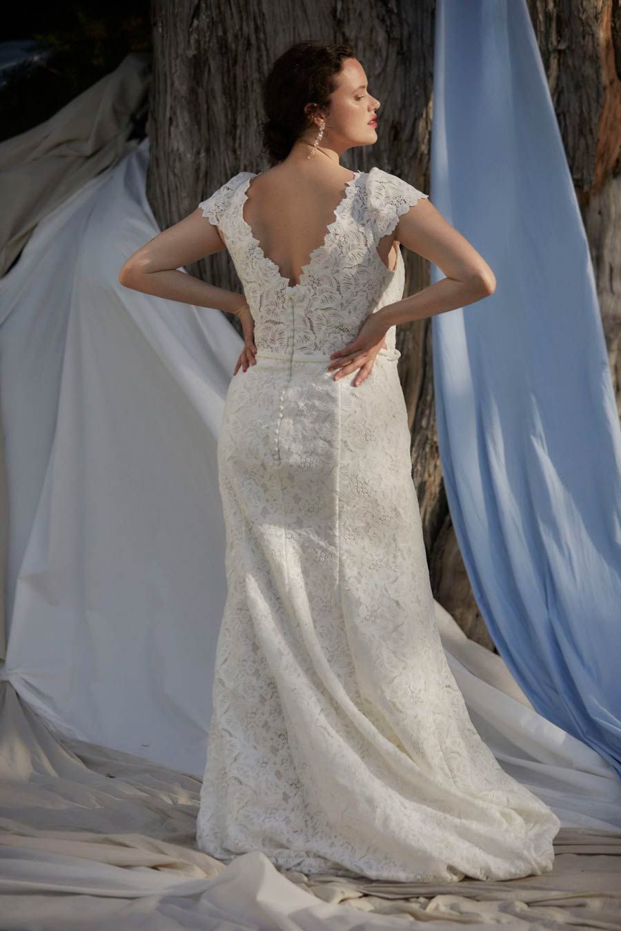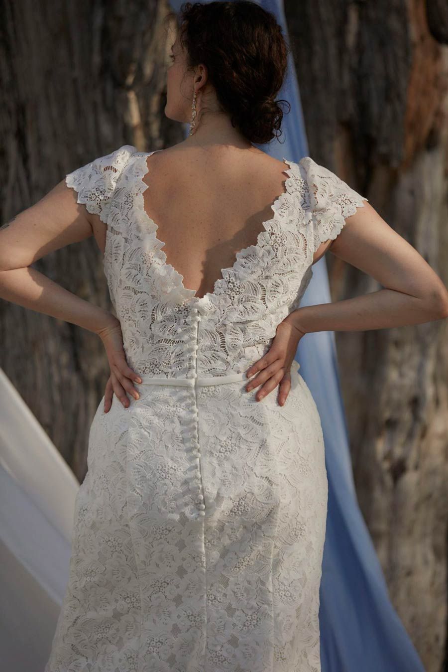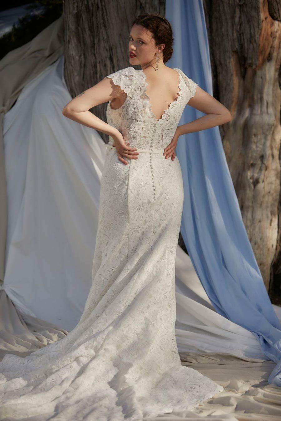 The bodice features a deep V neck and a beautiful, corseted fit that’s emphasised by the fabric choice. The back is low, with a row of lace-covered buttons to secure. A thin belt emphasises the natural waist, while the stretch lace skirt skims over hips before flaring out into a small train and flattering mermaid silhouette.