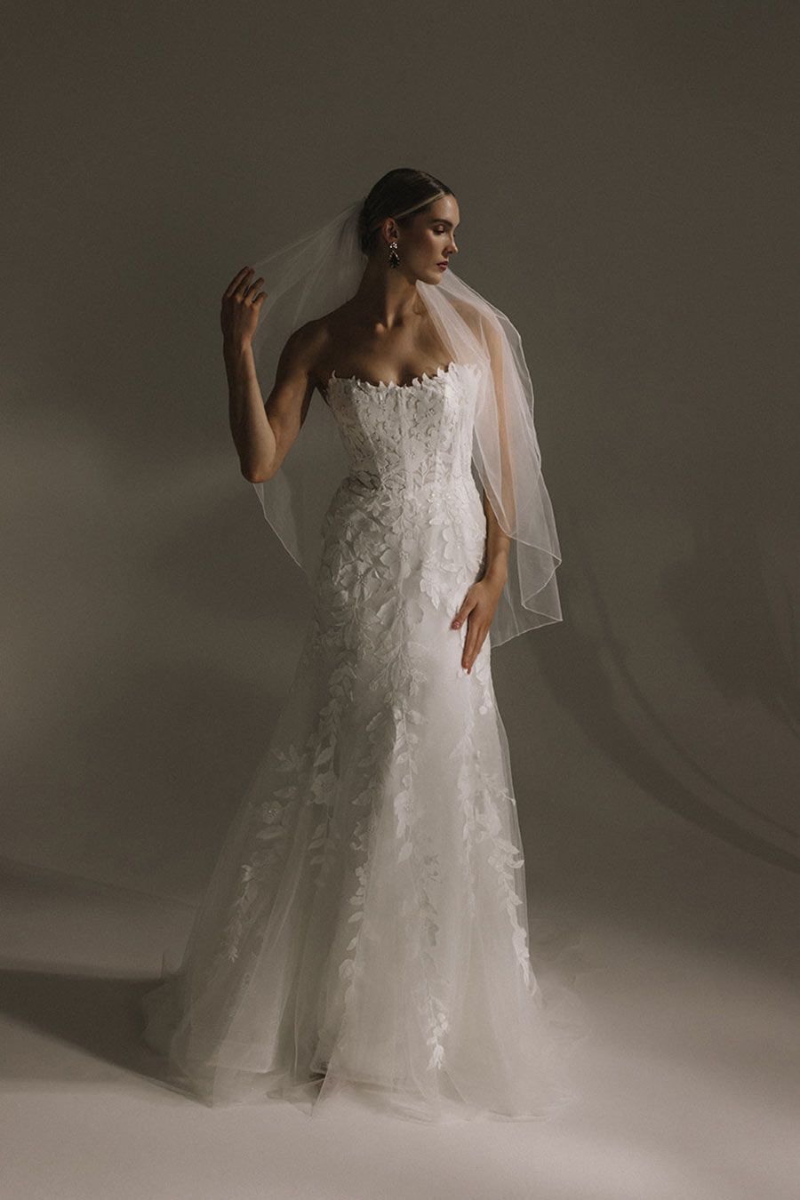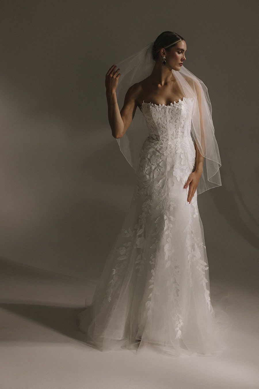 The translucent bodice is form-fitting and strapless with light boning for support. Exquisite hand-cut petals cover the bodice and cascade seamlessly over the hips where the lace glimmers down the skirt in beautiful tendrils.